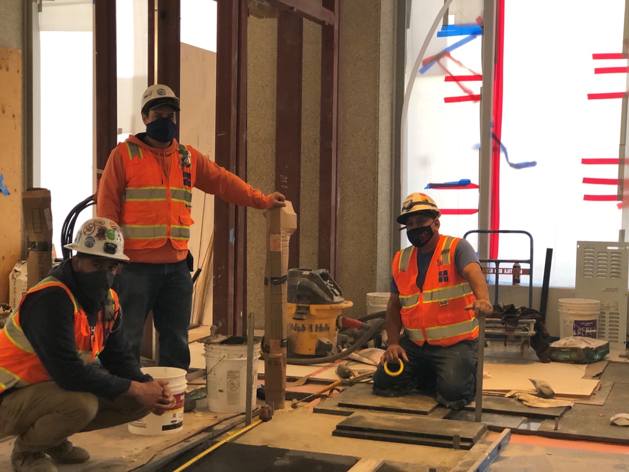 BAC 3 tile members working for D&J Tile, laying tile at the Trinity Building in San Francisco