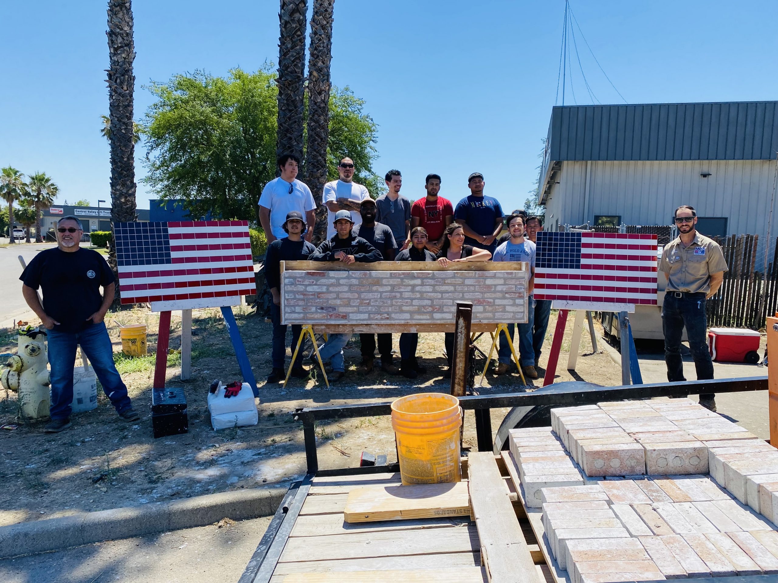Each Cohort is a mix of individuals who are leaning the building trades. Typically, classes last about six to eight weeks, during which time students are engaged with hands-on demonstrations and projects they build themselves. Note the brick mock-up in the accompanying photo on this page; that’s where cohort students learn to lay to the line.  We also teach students to lay tile on cement board to create American flags.